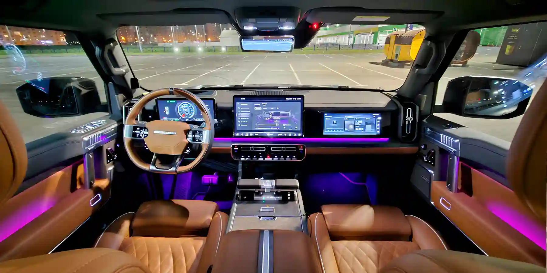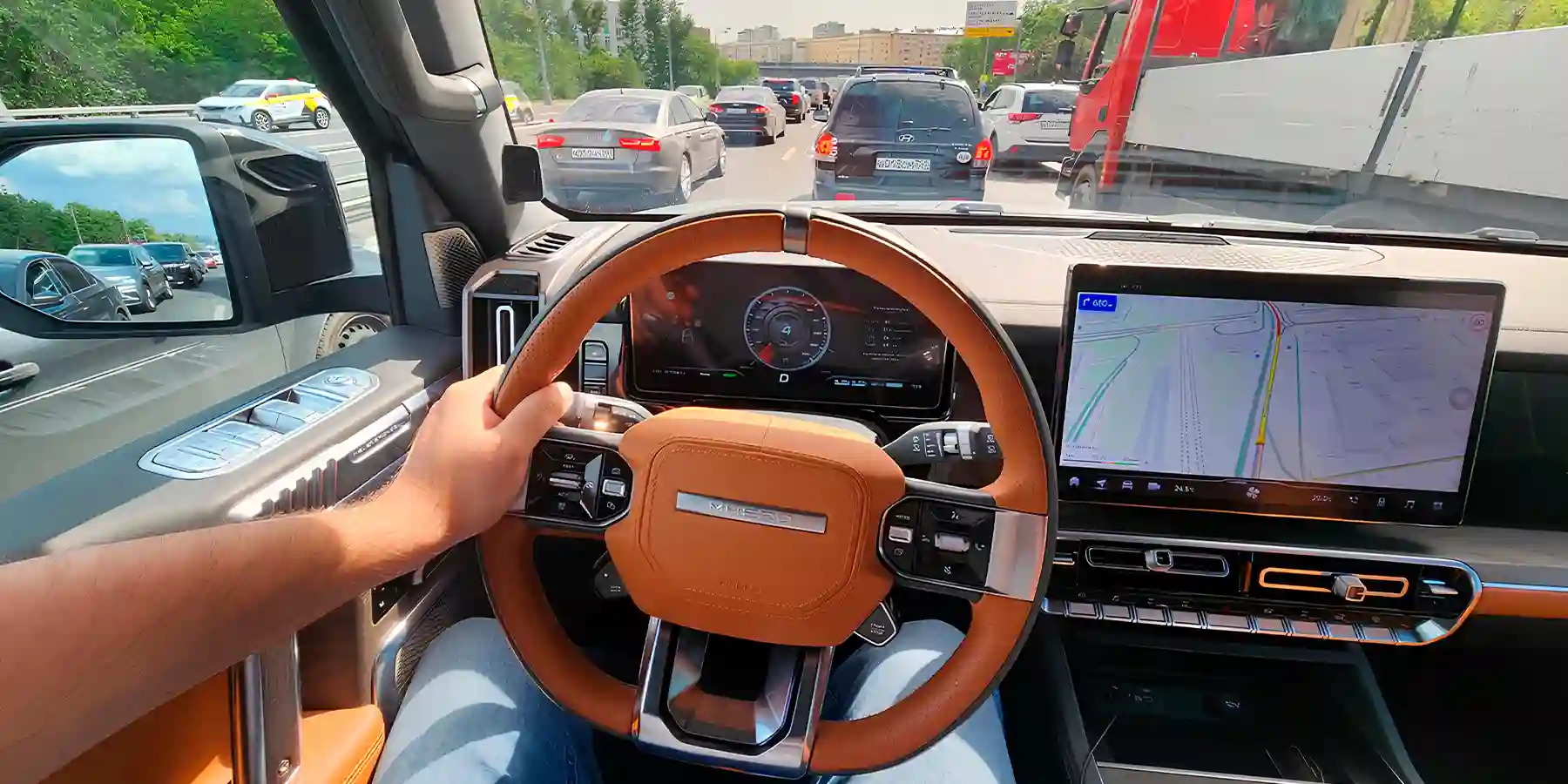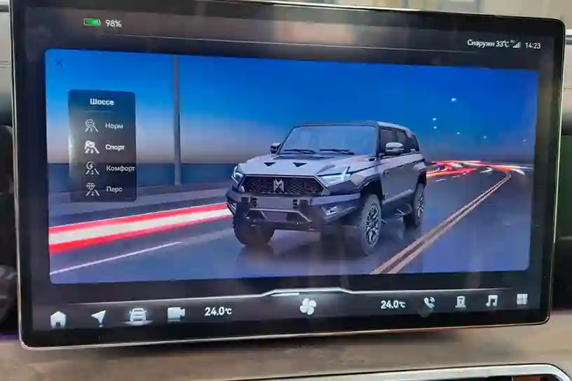 Несмотря на обилие физических кнопок, управление всеми основными функции, по современной традиции, зашиты в экран. Официальный M‑HERO отличает русифицированное меню всех трех дисплеев. Приборка тут предлагает три темы на выбор, а в боковые окошки можно выводить различную информацию. Например, распределение крутящего момента по осям или анимацию работы подвески. Режим ночного видения включается отдельной кнопкой на руле.