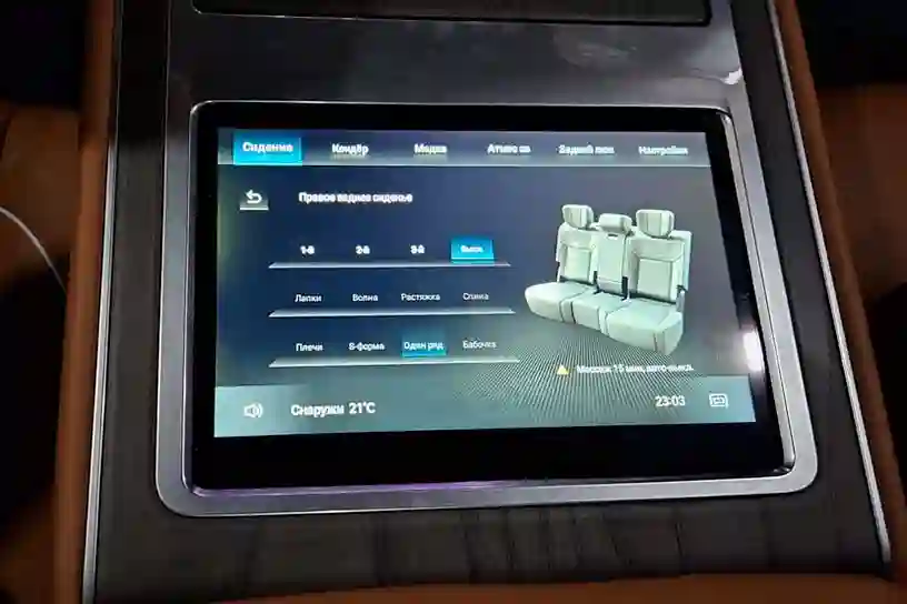 Задним пассажирам предлагается огромное количество регулировок: у каждого кресла их тут по восемь! Не всякое водительское сиденье предлагает столько настроек, отрегулировать можно даже поясничную поддержку и угол наклона подушки. Как и на переднем ряду, тут есть обогревы, вентиляция и массаж. Для управления всеми благами в центральном подлокотнике предусмотрен экран. Отзывчивость у него хорошая, а картинка сочная.