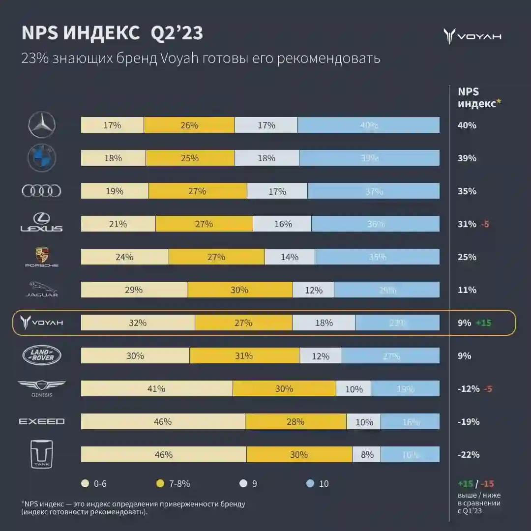 В первом полугодии 2023 годалюксовый бренд VOYAH стал лидером по росту индекса NPS — увеличение готовности рекомендовать к покупке продукцию люксового бренда VOYAH составило 15 процентных пунктов при уровне значимости 95%. В то время как другие игроки анализируемого сегмента продемонстрировали стагнацию или падение. По итогам второго квартала 2023 года NPS-индекс составил 9%, что позволило бренду, меньше чем за год присутствия на российском рынке, превзойти показатели ряда грандов мирового автопрома, включая известные премиальные марки с вековой историей. Более того, результаты некоторых из них даже не смогли достичь положительного значения. Эксперты рассчитывали индекс NPS среди потребителей, знающих марку, как разницу между теми, кто готов или не готов рекомендовать ее модели к покупке. Таким образом, в настоящий момент показатель позитивного отношения к VOYAH находится на уровне выше среднего.